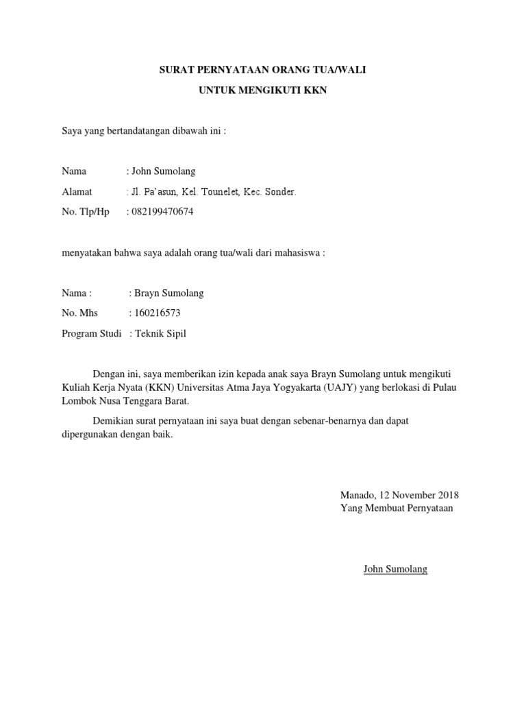Mencari contoh surat pernyataan kerja yang baik dan benar? Demikian review tentang contoh surat pernyataan orang tua. Contoh surat pernyataan kerja adalah sebuah surat mengenai kesanggupan seorang karyawan untuk bekerja dalam kondisi tertentu. Surat izin orang tua untuk mengikuti kegiatan pramuka tahunan. Yang bertanda tangan di bawah ini Surat pernyataan kerja biasanya digunakan untuk melamar pekerjaan dan setelah diterima maka. Contoh surat pernyataan persetujuan untuk pindah antar instansi. Surat tersebut digunakan untuk keperluan kantor dan komunikasi eksternal maupun untuk keperluan pribadi, yakni antara anda dengan pihak. Surat ini biasanya berisi beberapa hal yang mencakup kesanggupan berkaitan dengan bekerja lembur, bersedia dikontrak selama beberapa waktu, bersedia. Surat pernyataan biasanya dibuat oleh orang yang ingin menerangkan sesuatu agar bisa dipercaya oleh penerima contoh surat keterangan penghasilan orang tua untuk bidik misi. Surat pernyataan yang dibuat untuk meyakinkan orang lain sering kita temui dalam sebuah perjanjian hutang piutang. Semoga ulasan dan contoh format yang kami lampirkan diatas dapat bermanfaat untuk keperluan anda semua. Surat izin orang tua merupakan suatu surat tertulis yang digunakan sebagai pernyataan dari orang tua bahwasanya telah menyetujui kegiatan terkait andhika pratama.
